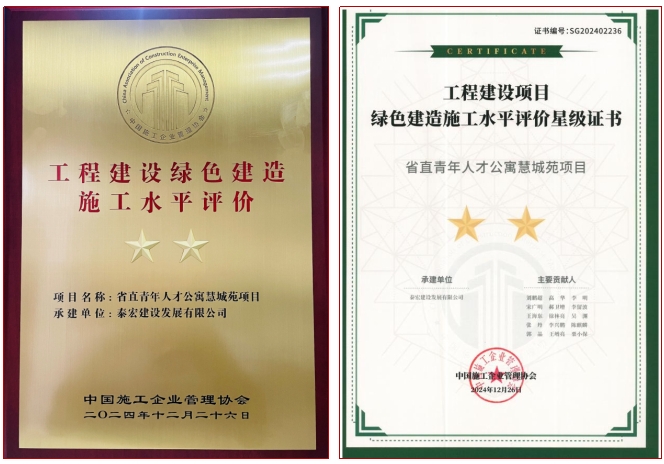 2025年4月16日,由中国施工企业管理协会举办的“2025年工程建设行业绿色低碳建造工作推进大会”在郑州市隆重召开,会上颁发了“2024年第二批工程建设项目绿色建造施工水平评价”证书与奖牌,泰宏建设承建的“省直青年人才公寓慧城苑项目”,获得“工程建设项目绿色建造水平”二星级评价。